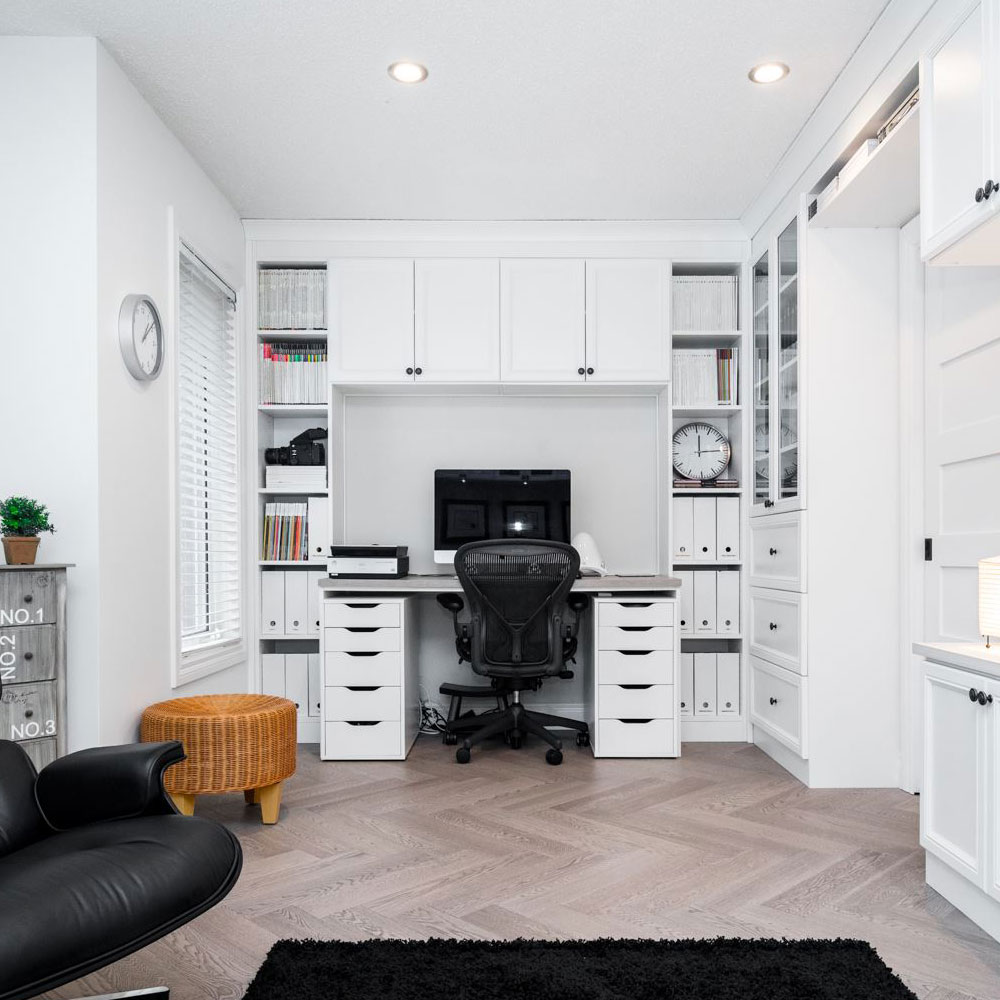 Our custom home office designs increase productivity levels while supporting your body’s natural posture. We consider many factors such as desk height to promote healthy sitting positions, efficient layouts to facilitate movement, and storage configuration options to decrease strains. Our sophisticated designs also include accommodations for all your wiring and technological needs to maximize your connectivity.